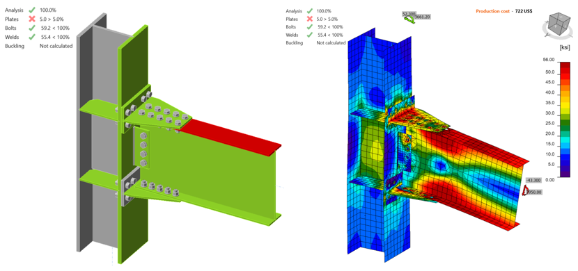 The IDEA StatiCa model was created for variation 4 using mill certificate material properties. 5% of plastic strain was captured on the beam flange when the shear force and the corresponding moment were 45.50 kips and 8,350 kips-in., respectively (Figure 5.21).