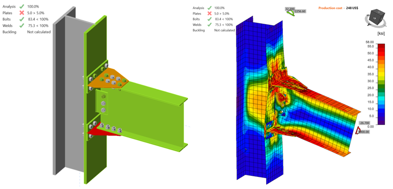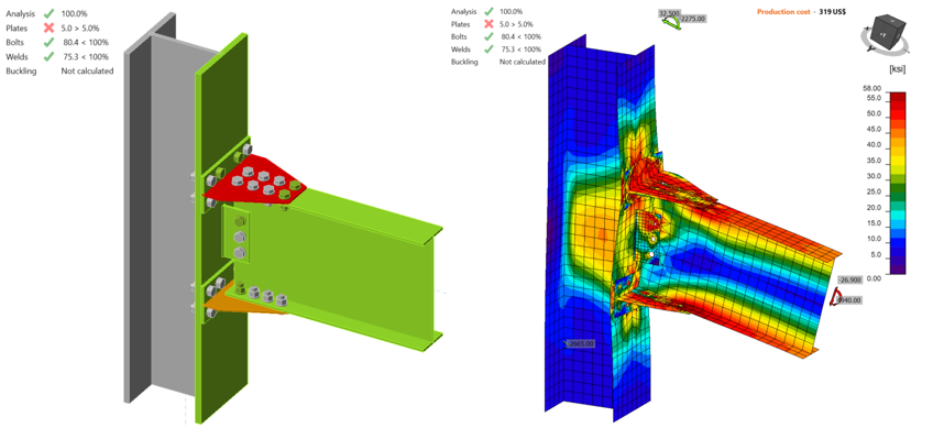 For variation 3, the IDEA StatiCa model was developed using mill certificate material properties. When the shear force and the corresponding moment reached 45.50 kips and 8,350 kips-in., respectively, 5% of plastic strain was achieved on the beam flange (Figure 5.20).
