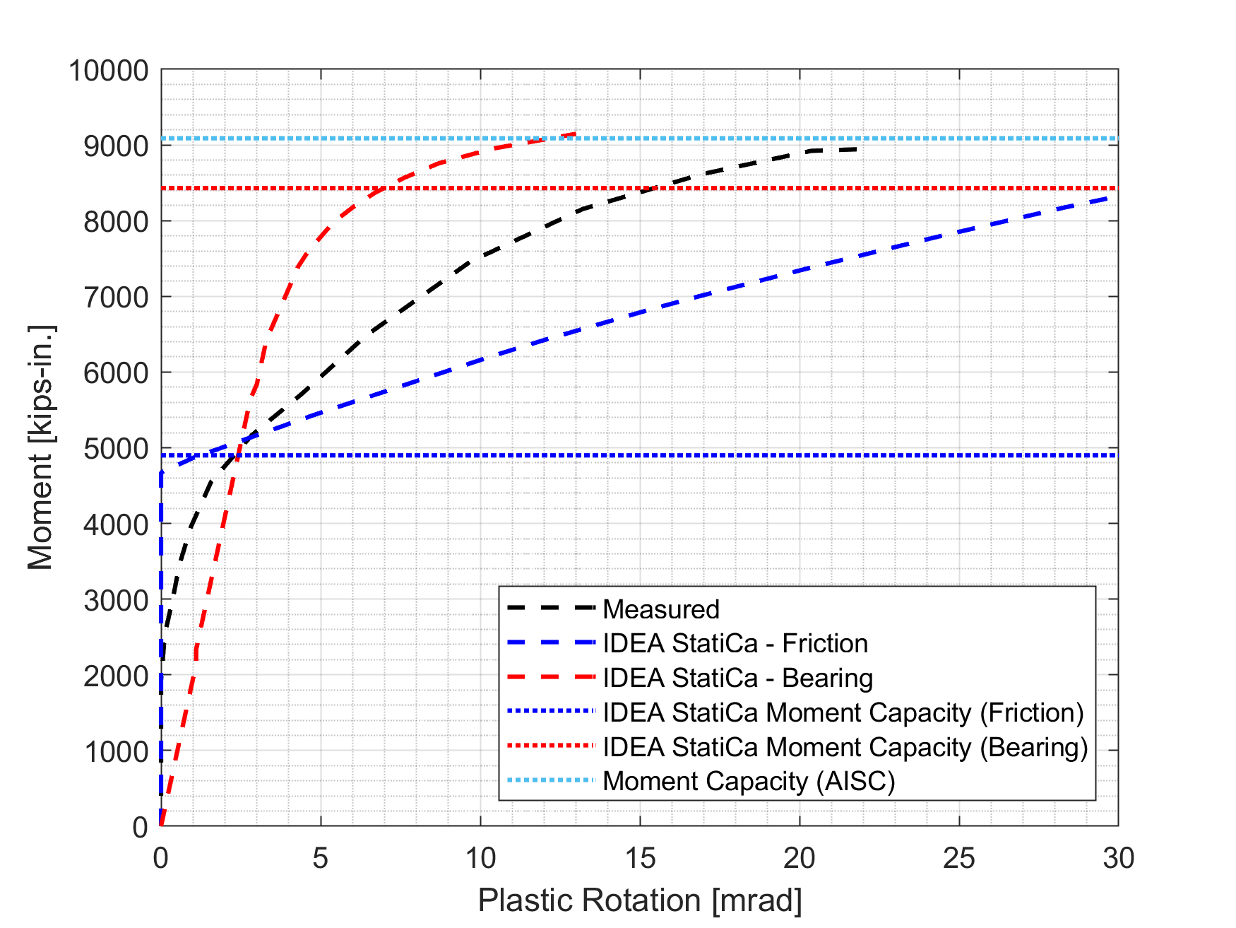 To estimate the behavior of tension-controlled bolts on capacity and rotational stiffness of the connection, two different IDEA StatiCa models were developed for the baseline model using two different bolt types: 1) bearing, and 2) friction. Mill certificate material properties (See Table 5.2) were introduced in the software, and the overstrength coefficients, Ry and Rt, and all LRFD resistance factors were set to 1.0. A beam-column frame model was developed using SAP2000 with the lengths of the column and beam in the test setup, and the forces at column centerline were obtained. Using “Loads in equilibrium option”, stress-strain analysis (EPS) was performed to calculate the capacity of the baseline model. The loads were gradually increased until any of the following is achieved: