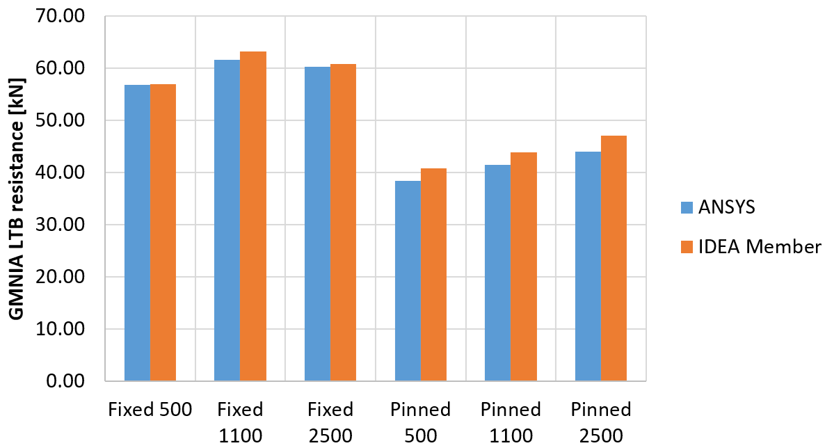 The results of both software packages are corresponding closely. IDEA Member provides slightly lower critical buckling load and slightly higher lateral-torsional buckling strength.