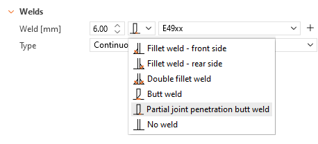 Partial joint penetration groove/butt welds are available for AISC design code and are embedded also for Australian and Canadian codes.