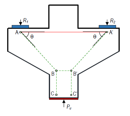The strut-and-tie truss model used for designing these specimens is illustrated in Figure 1.15. The horizontal alignments of Nodes A and A' were aligned with the center of the bearing plates, while Nodes B and B' were positioned at the quarter points within the column width. The vertical positioning of Nodes B and B' was determined as the midpoint of the rectangular compression block at the column face. The design process involved verifying the yield strength of Tie AA', the compressive strength of Struts AB, A'B', BB', BC, and B'C', and the back, bearing, and inclined faces of Nodes A, A', B, and B'.