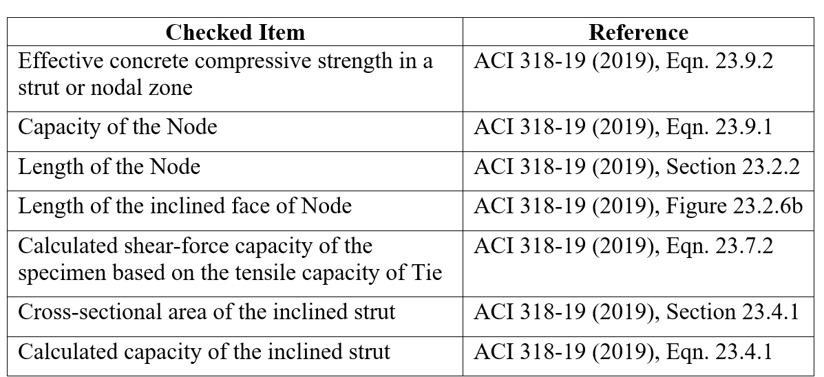 Table 1.6 presents the design checks identified for corbel specimens from ACI 318-19. The structural integrity of concrete elements is rigorously assessed through various checked items, each referencing the American Concrete Institute (ACI) 318-19 building code.