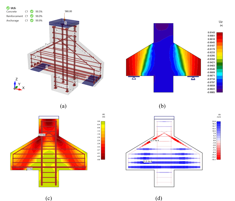 Figure 1.16: (a) Corbel C0 at 580 kips (2578 kN) loading, (b) deflection of C0 under 580 (kips) loading, (c) concrete principal stress σ_c of C0 at 580 (kips) loading, and (d) strain in the reinforcement steel.