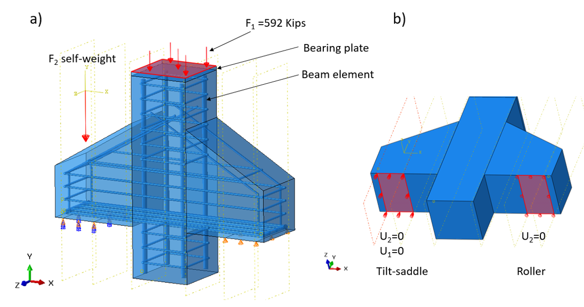 In this section, the baseline model developed in Section 1.4.1 (i.e., Specimen C0) was reconstructed using ABAQUS software (version 2023) for finite element (FE) analysis, and the results were compared with those obtained from IDEA StatiCa. In the model, in addition to the self-weight, the vertical load of 592 kips (2633 kN) was imposed to the top bearing plate as illustrated in Figure 1.23a. Two boundary conditions similar to the experimental tests and IDEA StatiCa model (i.e., roller type in right and tilt-saddle type in left) were applied to Specimen C0 (see Figure 1.23b).