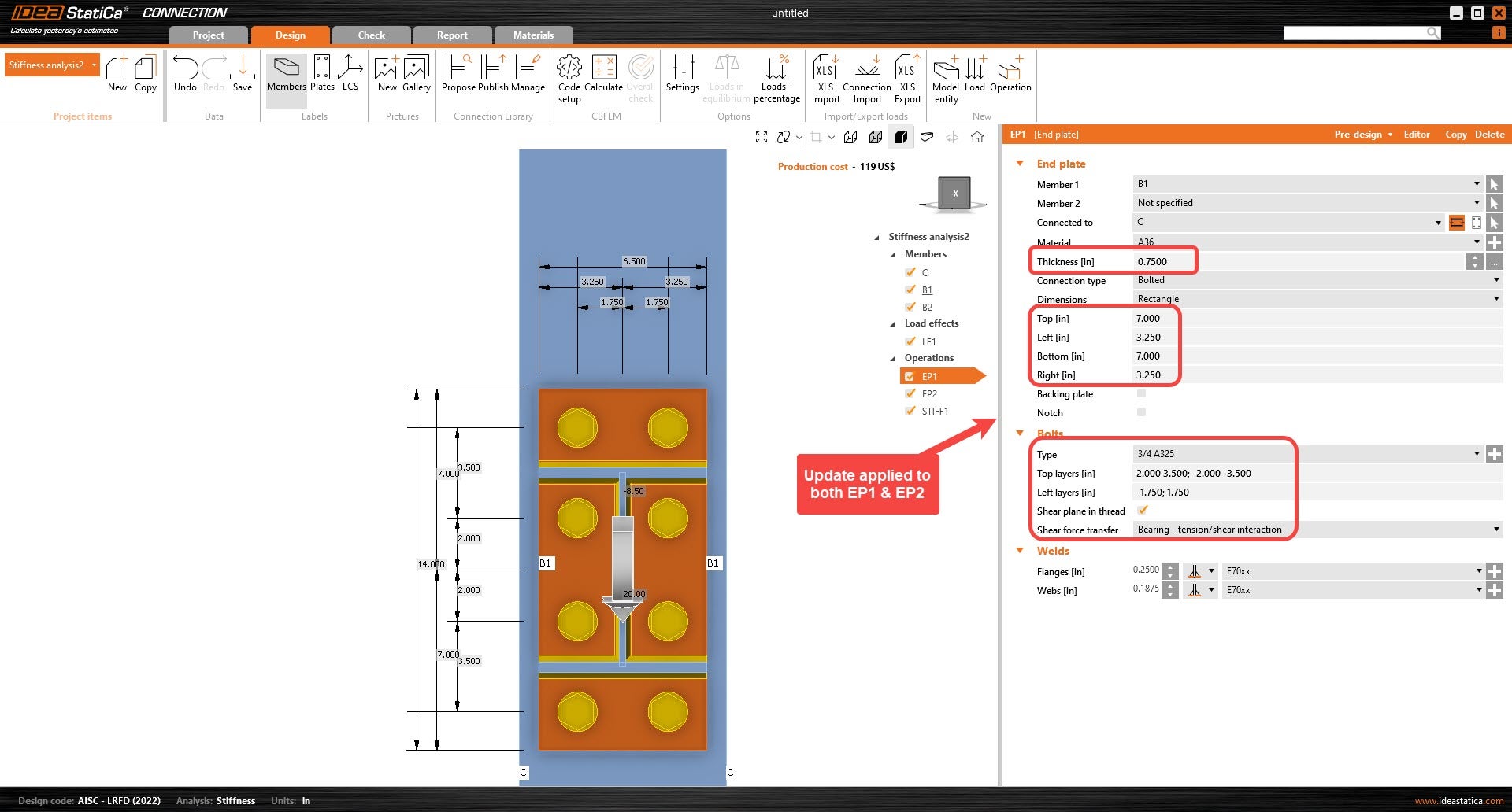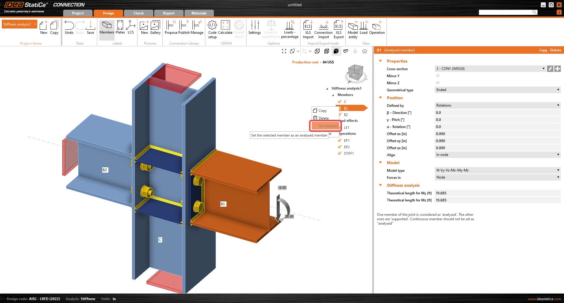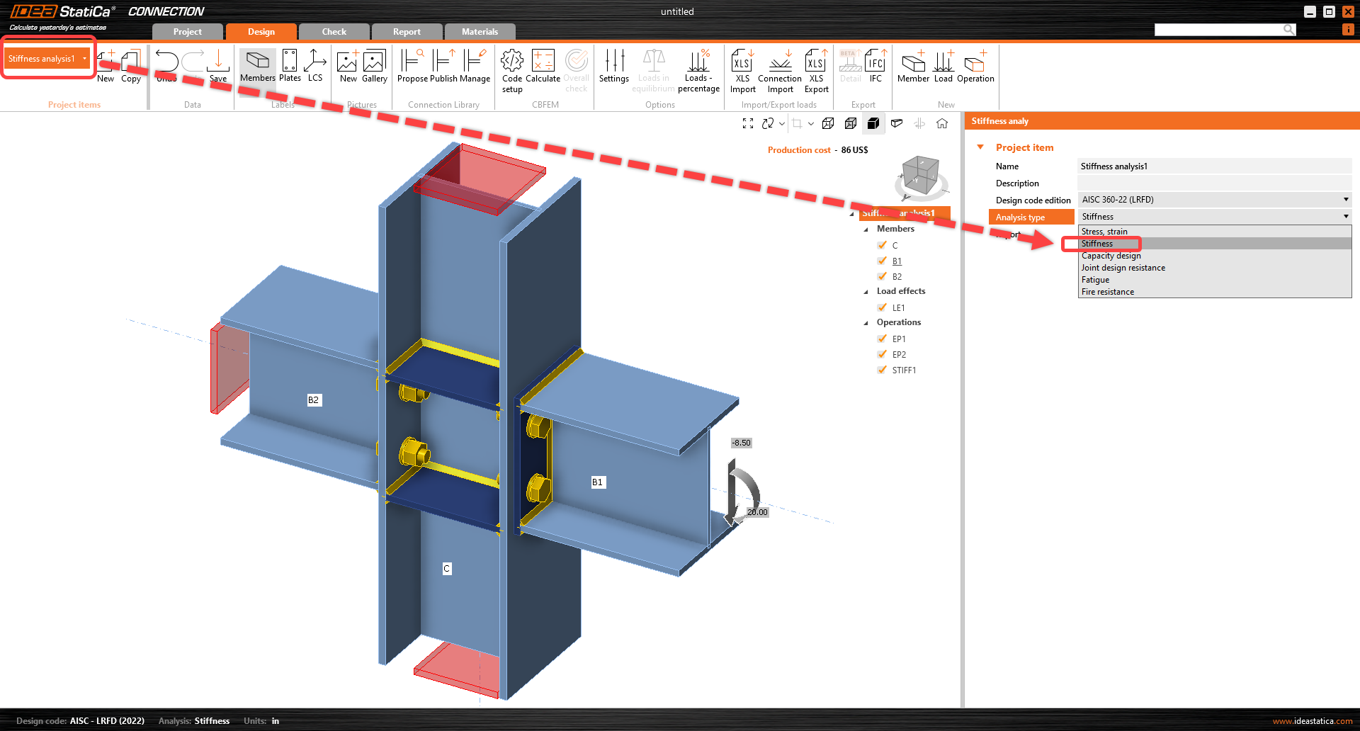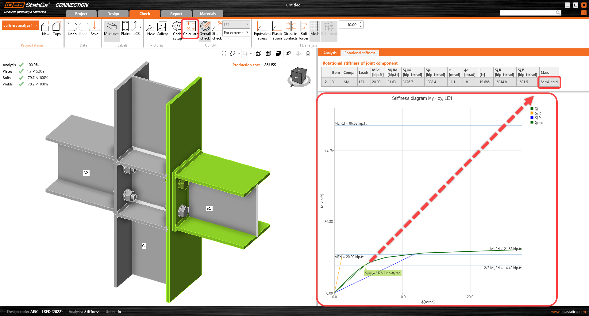 Now run stiffness analysis again by icon Calculate from the top ribbon. And you can notice the change in results from Semi-rigid to Rigid.