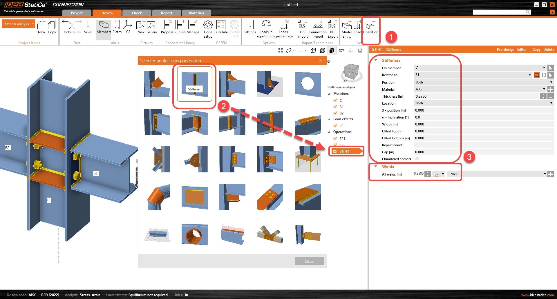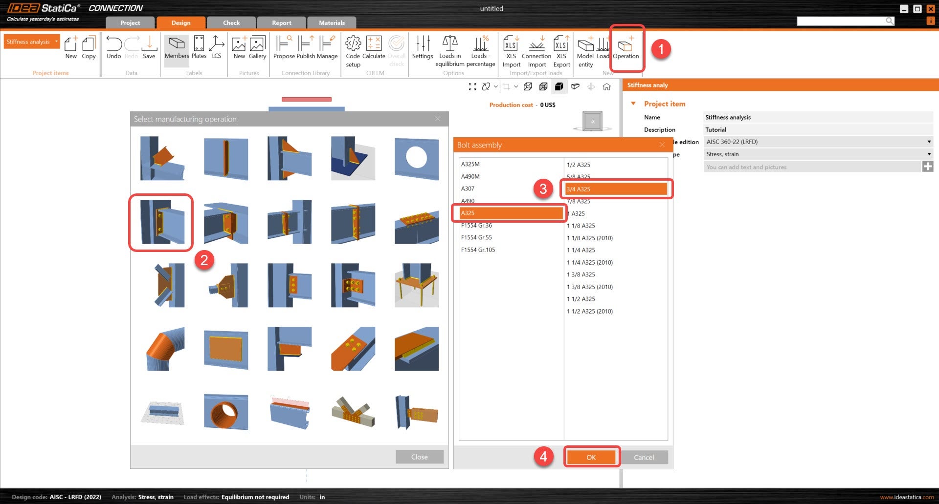 You will define a set of manufacturing operations to model connections between members. Start with the right mouse button and click on the Operations row in the tree of entities in the 3D scene. In the dialogue with all available manufacturing operations, you will choose the Endplate operation and proceed with the choosing of the desired bolt assembly, the A325 5/8".