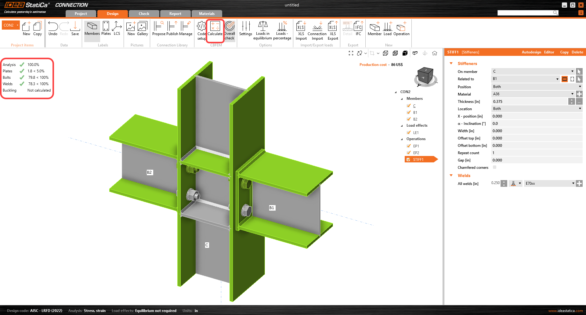 Select Calculate in the ribbon to run the analysis based on the CBFEM method. The numerical model is automatically generated, the calculation is performed, and you can directly see the overall check results in the top-left corner of the scene.