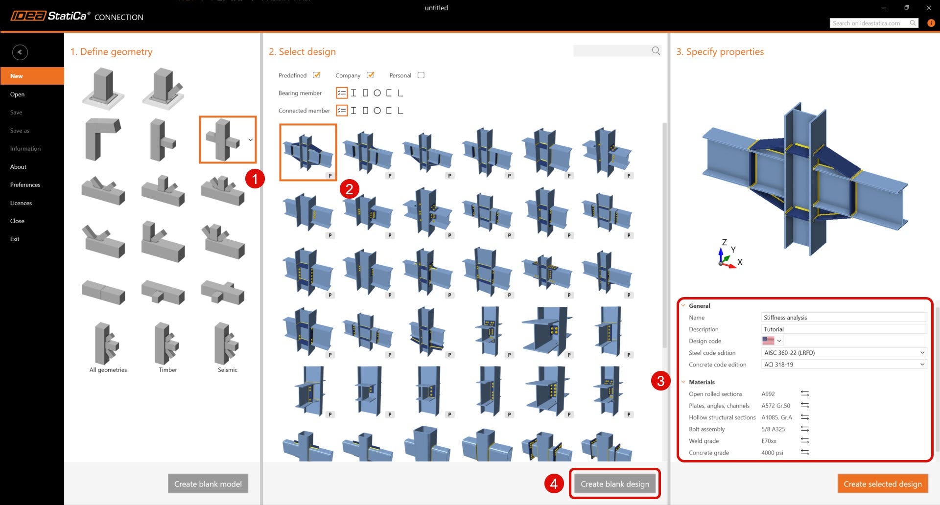 Start with launching the IDEA StatiCa Connection. Create a new project by selecting a starting template closest to the desired design, fill the name and choose AISC 360-22 (LRFD) design code and default steel grade – A992.