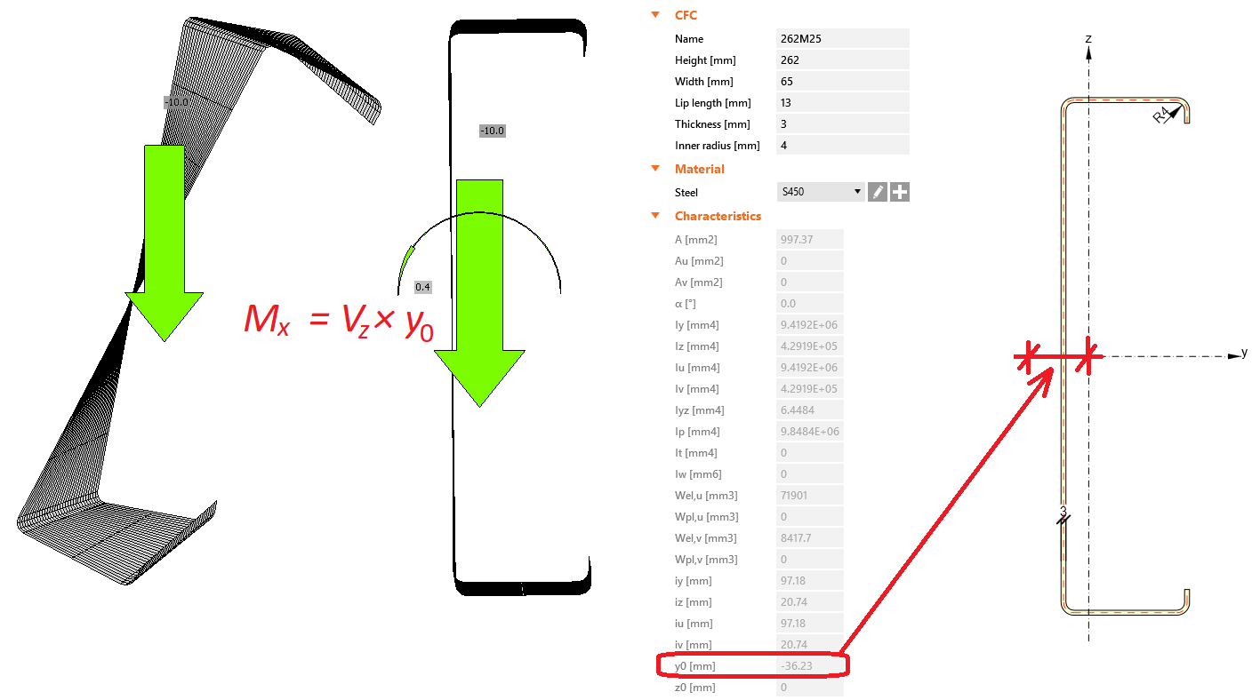 To correct the model, an equivalent contra torsion moment M'x has to be calculated and added to the load effects for this member. In this example, for LE1, the moment M'x = Vz * y0 = 1502 * 0,113 = 170 kNm has to be added extra.