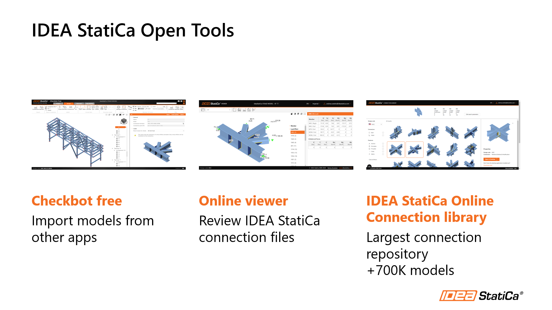 Well, usually, the connection designer is the only one with the IDEA Statica license. However, now we have these three open tools for everyone: engineers of record, connection designers, detailers and fabricators. The solutions I talked about are based on the use of these apps; let's review the different proposed workflows.