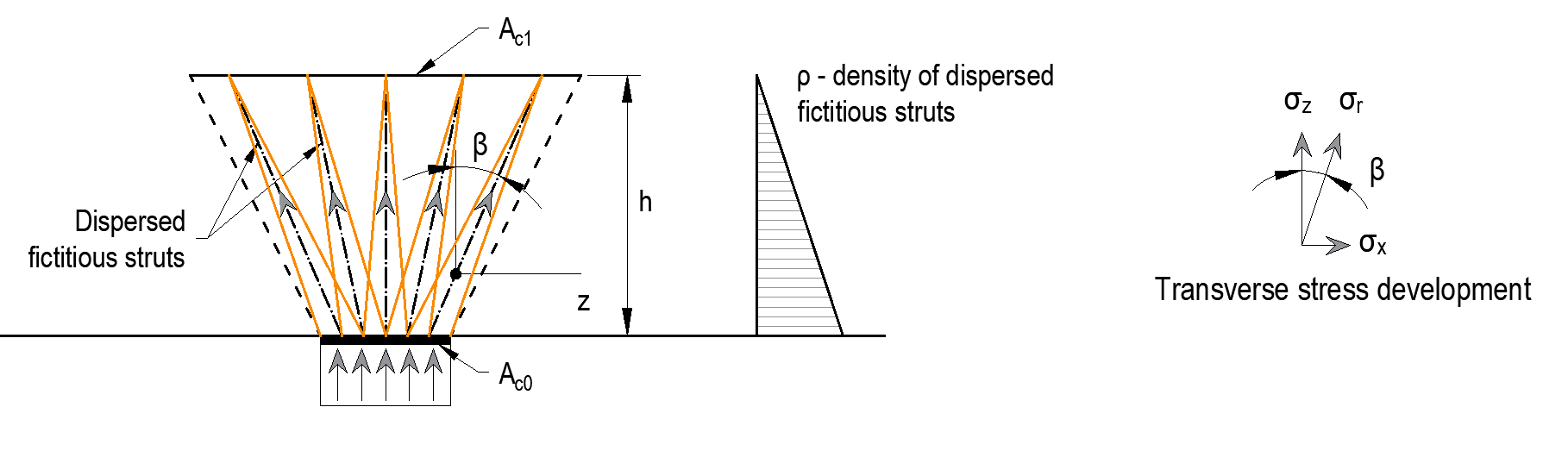 This functionality guarantees that models are getting converge and simultaneously comply with design criteria for valid standards (Eurocode). The implemented method is independent of the finite element mesh. The bearing capacity is increased with the changing of the concrete area. The consequence of this state is constant stress along with the height of a cone. Dispersed fictitious struts affect the stiffness of the cone and correctly redistribute the transverse stress, which appears in this area. The density of each dispersed strut is increased to the direction of the applied load.
