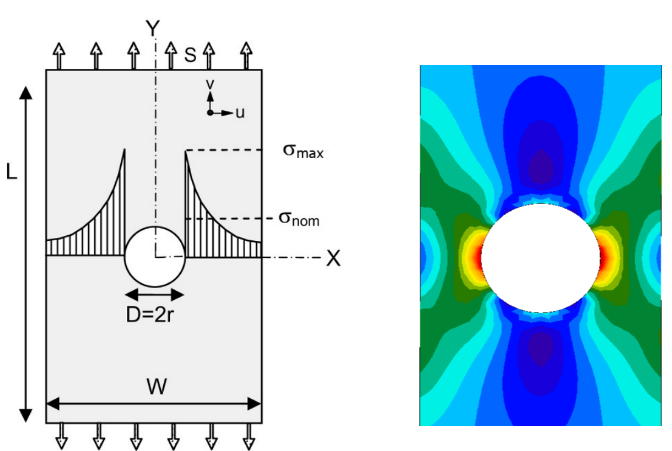 The stress concentration is observed in the vicinity of the geometrical irregularities as an abrupt change of the section or the openings. It’s called generally notches. The notches create the local increase of nominal stress. The result is an unequal stress flow along the cross-section. The ratio between the maximal and the nominal stress is called the stress concentration factor. The factor is dependant on the position of the load and the geometry of the notch. The values used to be found out from the experiments. Nowadays, we are using FEA to find out the stress concentration factor.