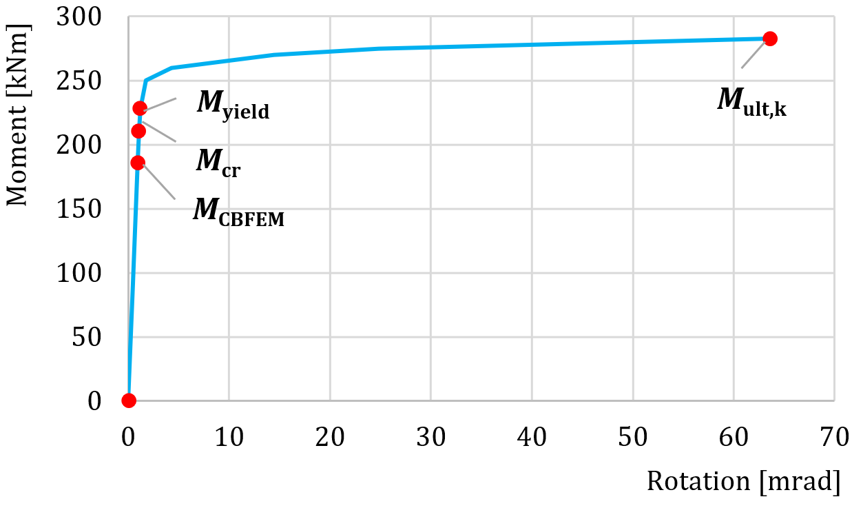 The global behavior of a beam-column joint with a slender column web described by moment-rotation diagram in CBFEM model is shown in Fig. 6.2.2. Attention is focused on the main characteristics: design resistance and critical load. The diagram is completed with a point where yielding starts and resistance by 5 % plastic strain.
