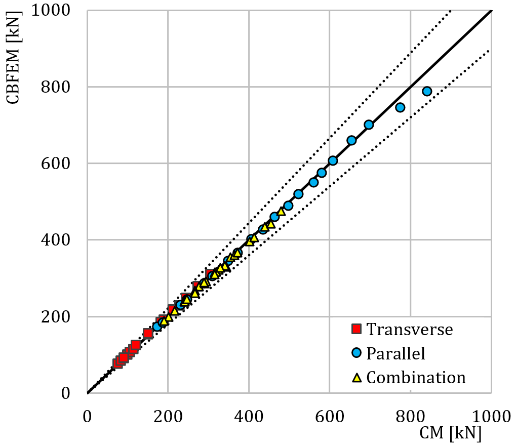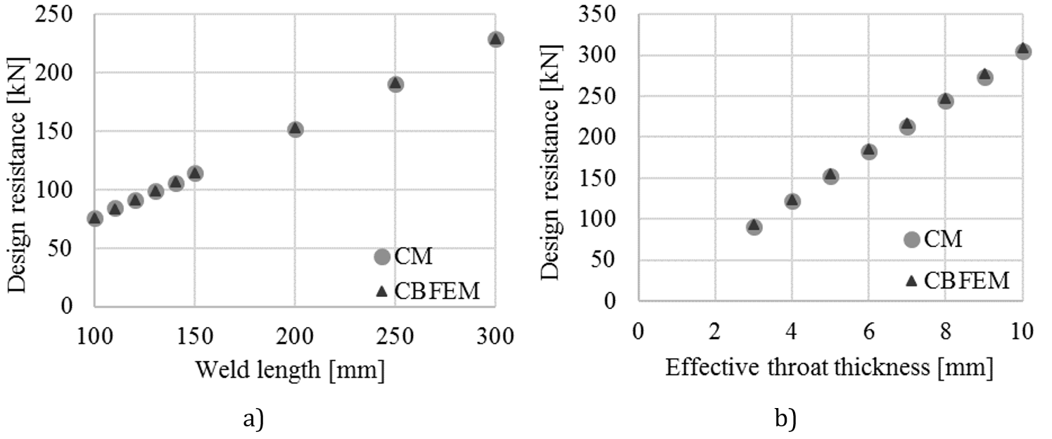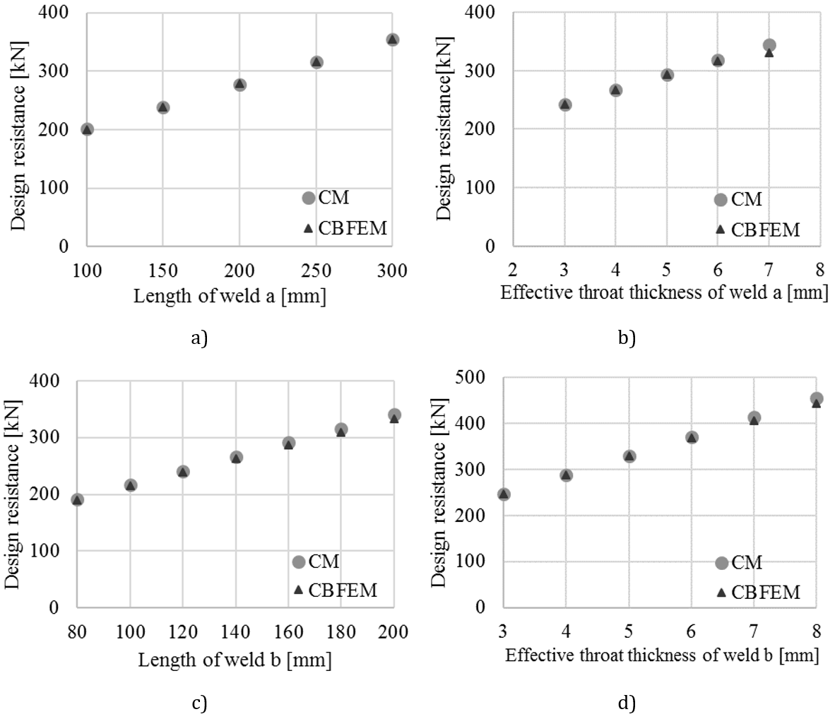 Results of CBFEM and CM are compared, and a sensitivity study is presented. The influence of weld length and effective throat thickness on the design resistance of the transverse weld, parallel welds, and a combination of both welds is shown in Fig. 4.1.3, 4.1.4, and 4.1.5, respectively. The sensitivity study shows good agreement for all weld configurations.