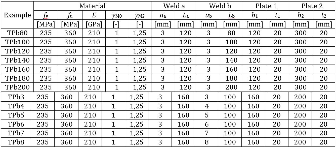 Overview of the considered examples and the material properties is given in Tab. 4.1.1. The weld configurations T is for transverse, P for parallel weld, and TP for a combination of both; see the geometry in Fig. 4.1.2. The sensitivity of two parameters, weld length and effective throat thickness, was investigated.