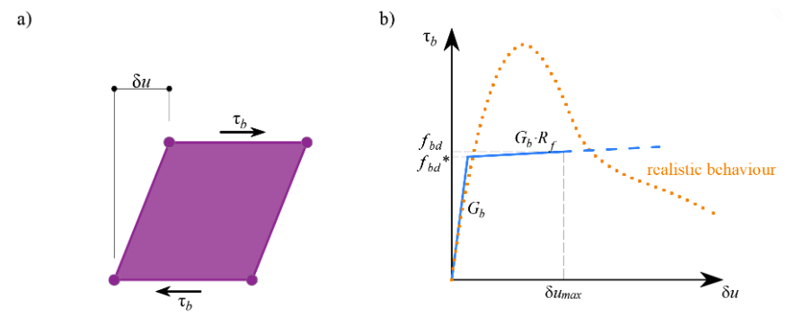 The bond stress 𝜏b (stress on the surface of the reinforcement bar) is calculated from the deformation of the bond element that represents the connection between concrete (2D element) and reinforcement (1D element). This relation is expressed by the stress-deformation function, see the figure below.