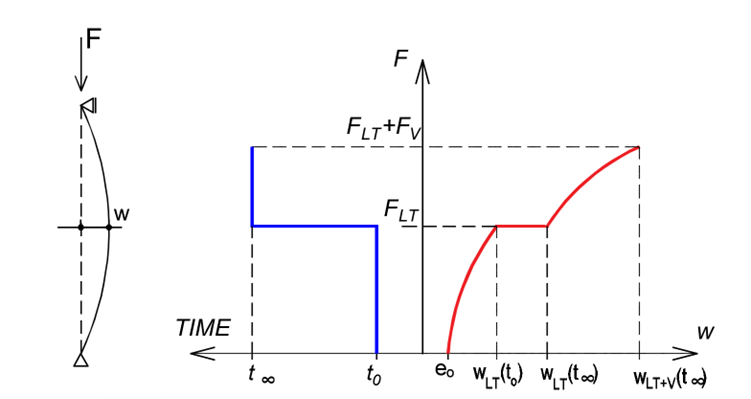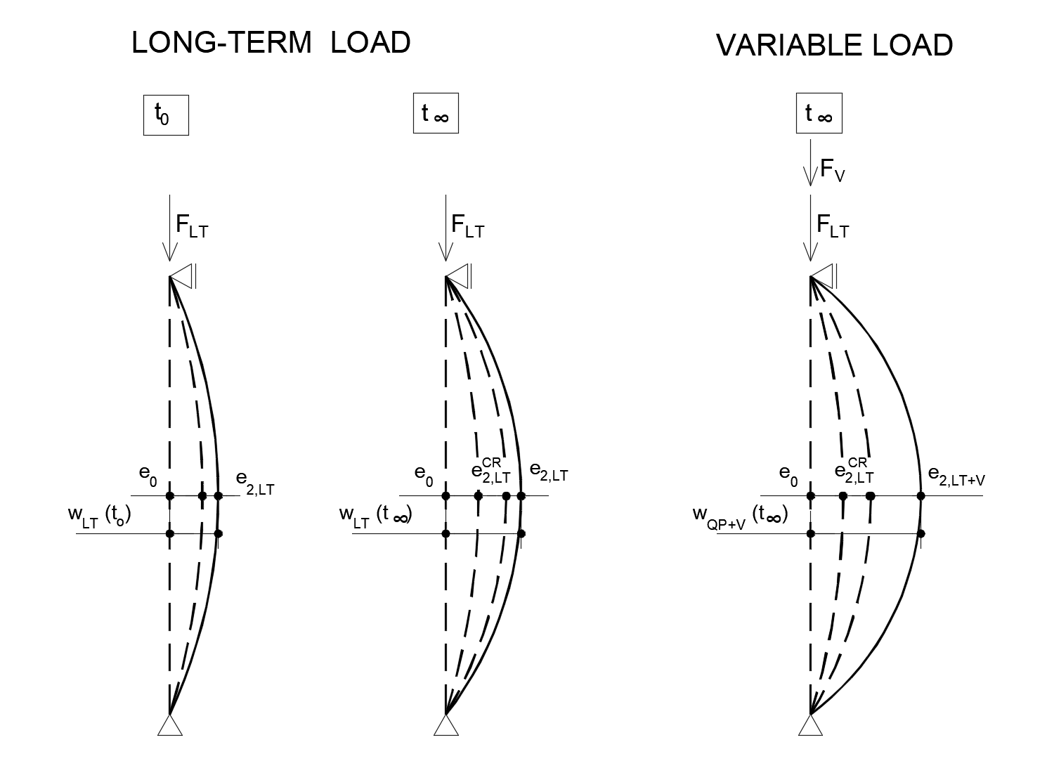 The development of the transverse deformation of the compressed element is shown schematically in the figure above. The total load is composed of a long-term load FLT and a short-term load FV (variable load). Before loading begins, only the geometric imperfection e0 forms the transverse deflection of the element. Once the element is loaded with the FLT force, the transverse deformation increases to wLT(t0). Due to the creep, the transverse deflection will increase to wLT(t∞) in the <t0;t∞> time interval. The total transverse deflection at the end of the life of the structure (time t∞) after the application of the short-term load FV is then wLT+V(t∞). The second-order effect caused by this deflection governs the design of a slender compression member.