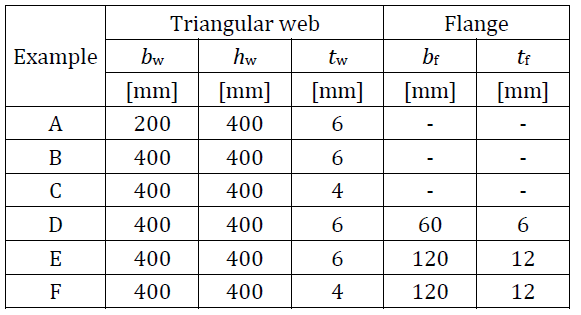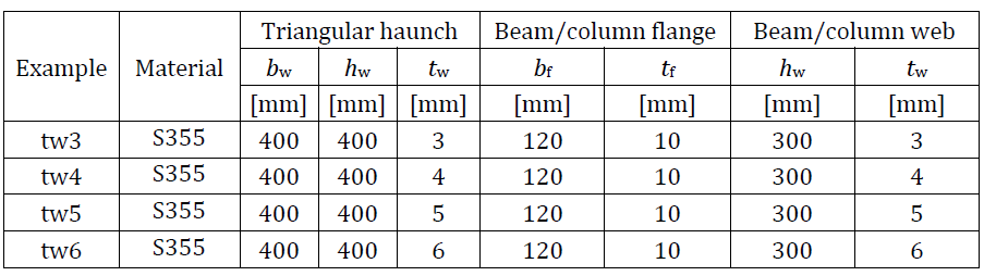 The design procedure in CBFEM models is described in section 3.10 Local buckling. The buckling analysis is implemented in the software. The calculation of the design resistances is done manually according to the design procedure. FCBFEM is interpolated by the user until the formula (2) is equal to 1. A beam-column joint with a haunch without a flange is studied. The thicknesses of beam and column webs are changing in the same way as the thickness of the triangular haunch. The same cross-section is used for beam and column. The geometry of the examples is described in Tab. 6.1.3. The joint is loaded by bending moment.
