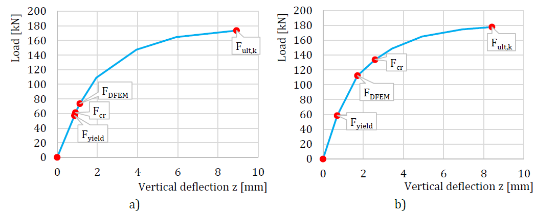Comparison of the global behavior of a haunch without flange described by load-deflection diagrams in DFEM model is prepared. The deflection is measured in the vertical direction in the middle of the specimen. Attention is focused on the main characteristics: design resistance and critical load. Two examples of a haunch without a flange are chosen to present as a reference; see Fig. 6.1.6. The design procedure in DFEM models covers the post-buckling reserve, which is observed in Fig. 6.1.6 a). The critical load Fcr is smaller than the design resistance FDFEM. The post-buckling reserve is observed in cases with very slender plates. The typical diagram is shown in Fig. 6.1.6 b), where the design resistance FDFEM does not reach the critical load Fcr. The load Fult,k refers to resistance by 5 % of plastic strain.