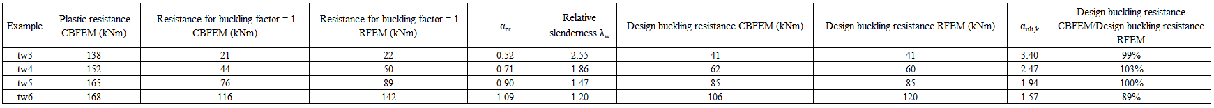 The design resistance calculated by CBFEM is compared with the results obtained by RFEM. The comparison is focused on the design resistance and critical load. The results are ordered in Tab. 6.1.4. The diagram in Fig. 6.1.7 c) shows the influence of the widener thickness on the resistances and critical loads in the examined examples.