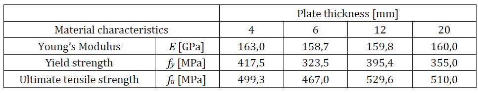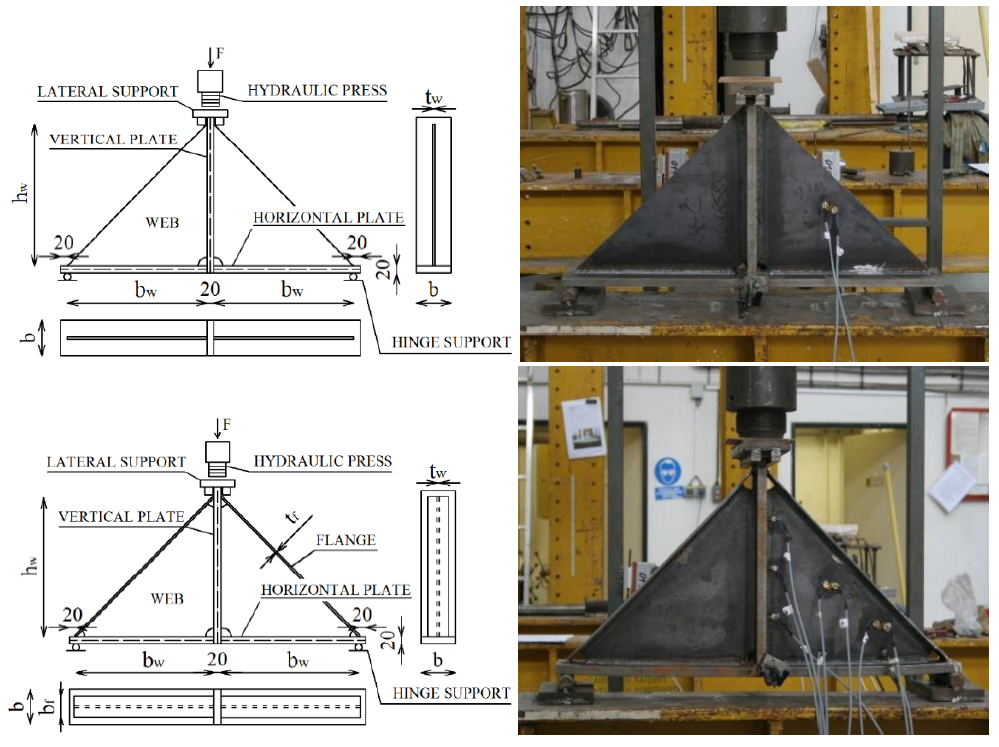 Experimental results of six specimens of haunches with and without flanges are presented. Three specimens are without flanges and three specimens are supported by additional flanges. Unstiffened specimens differ in the web thickness tw and the web width bw. Reinforced specimens differ in the web thickness tw, the flange thickness tf, and the flange width bf. The dimensions of specimens are summarized in Tab. 6.1.1. The test set-up for the specimen without a flange is shown in Fig. 6.1.1 (top) and for the specimen with a flange in Fig. 6.1.1 (bottom). Material characteristics of the steel plates are summed up in Tab. 6.1.2.