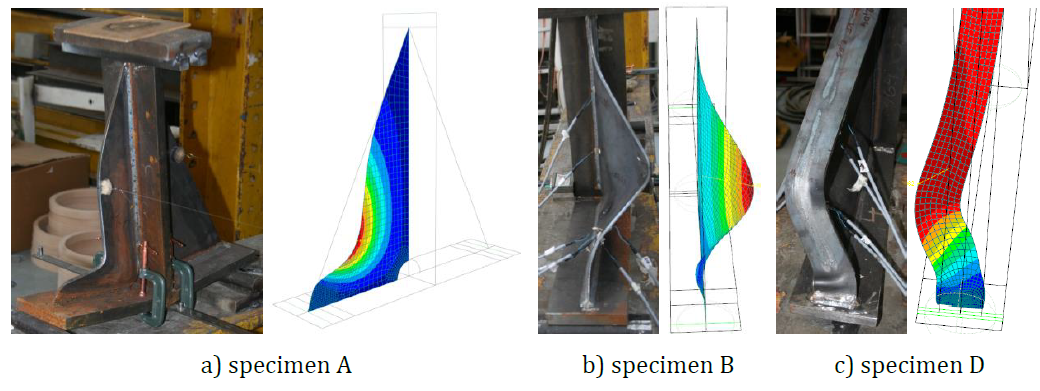 The comparisons of the final deformation states between numerical simulations and experimental results are performed at the end of the tests. Fig. 6.1.4 presents the comparison of the deformation of specimens A, B, and D after failure with RFEA. It can be found that good agreements between numerical models and experimental results of the haunches exist in the failure mode. For more details, see (Kurejková and Wald, 2017).