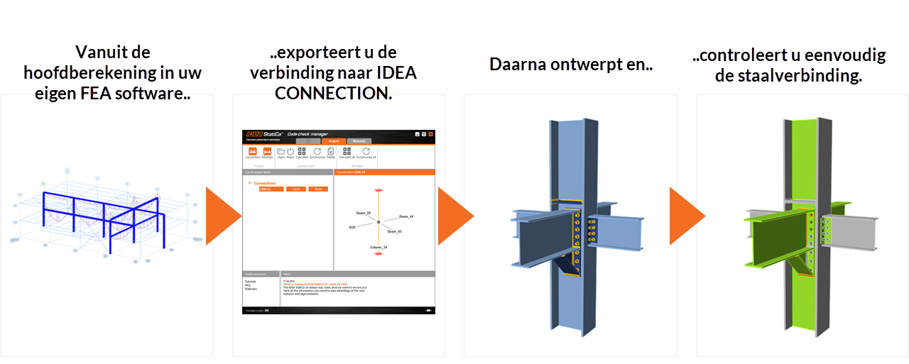 IDEA StatiCa werkt samen met uw RFEM / RSTAB. U kunt elke knoopin RFEM / RSTAB selecteren en deze exporteren naar IDEA StatiCa voor norm-controle. Alle liggers, doorsneden en interne krachten worden niet alleen geëxporteerd, maar deze kunnen worden gesynchroniseerd als het RFEM / RSTAB-model verandert. IDEA StatiCa en RFEM / RSTAB geven u een efficiënte workflow voor uw ontwerp in staal dat tijd en geld bespaart.