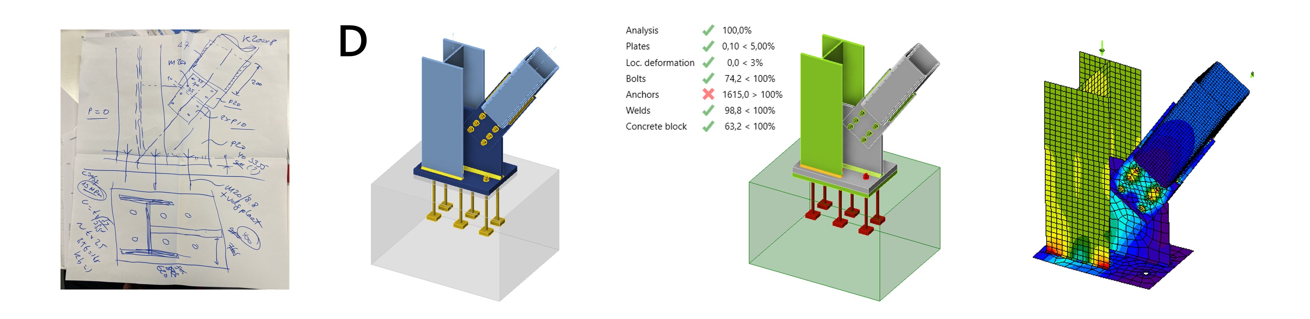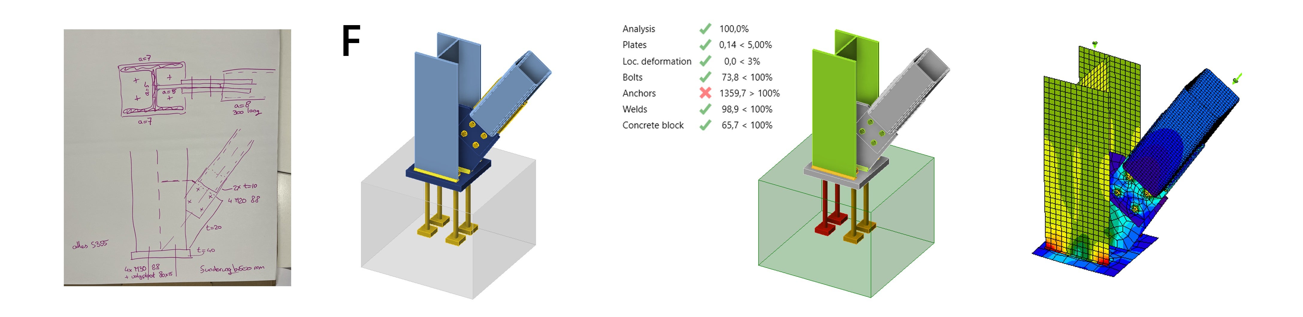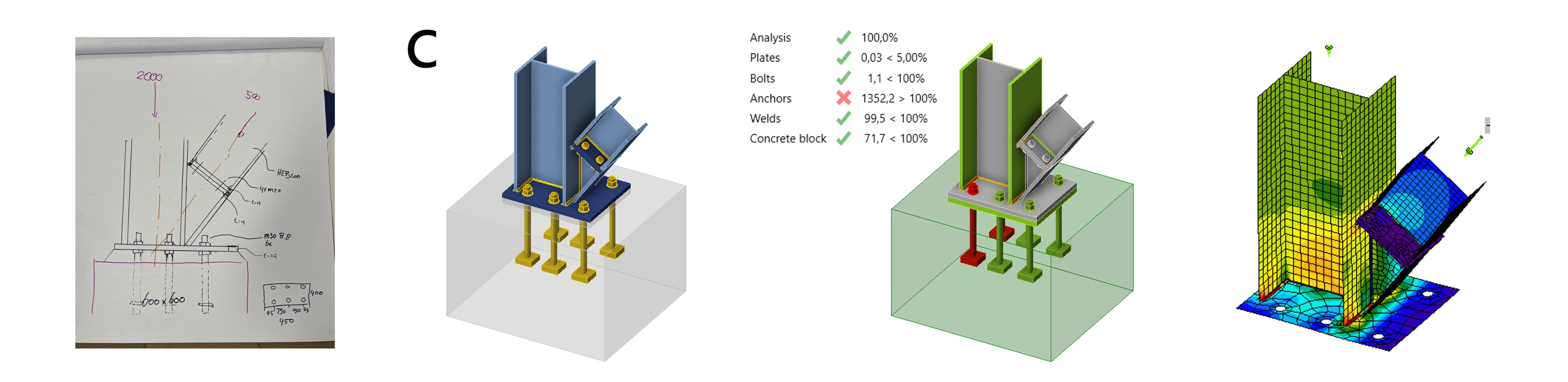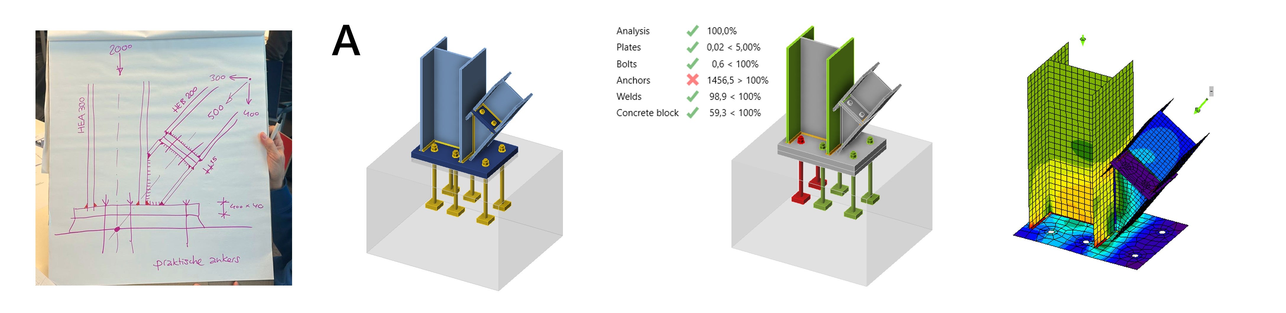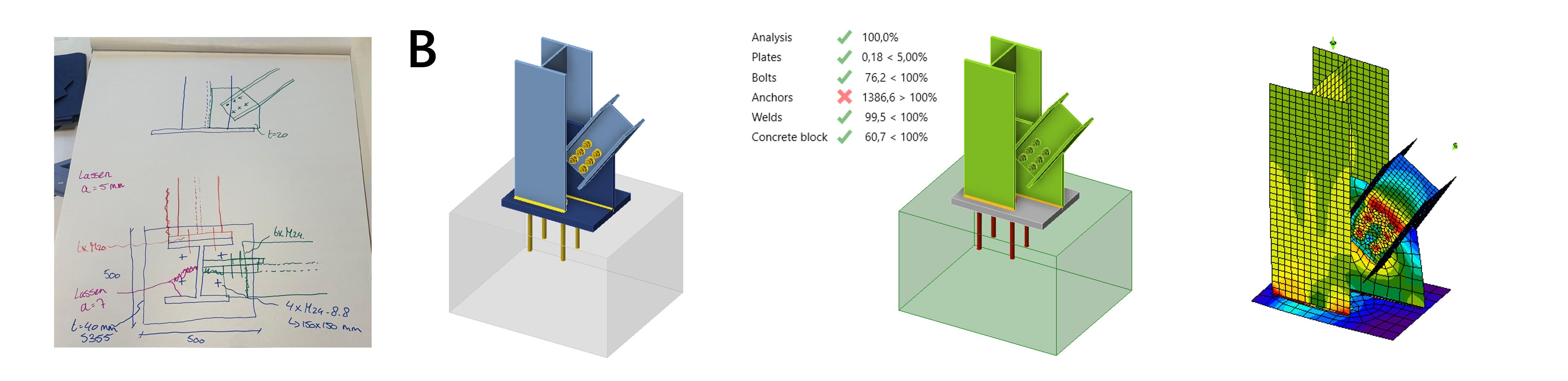 De focus ligt op de aansluiting van de diagonaal op de kolom, en het ontwerp van de voetplaat, inclusief de ankers en de fundering. Hieronder geven we een overzicht van de voorgestelde oplossingen. Aan de hand van de ontvangen schetsen en presentaties zijn de verbindingen gemodelleerd en doorgerekend in IDEA StatiCa. In het vervolg van dit artikel bespreken we de verbindingen, de opmerkingen van de experts en de berekende resultaten.