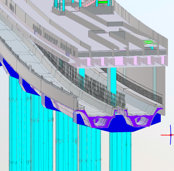 Een uitdaging van het project was het ontwerpen van de betonnen dwarsbalken, waaronder een gedeelde dwarsbalk tussen twee enkele kokerliggers die rails dragen voor verschillende richtingen. De twee openingen in de kruiskop veranderden het typische gedrag, waardoor asymmetrische constructies moesten worden ontworpen die moeilijk handmatig te berekenen zouden zijn geweest.