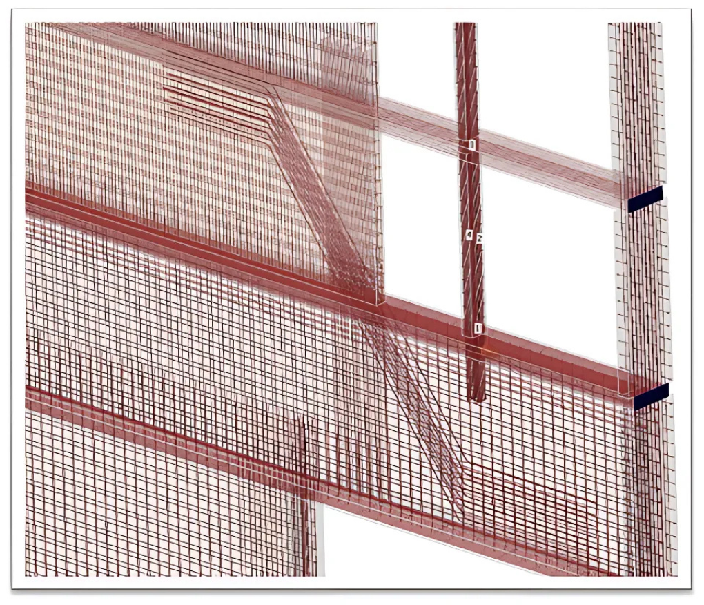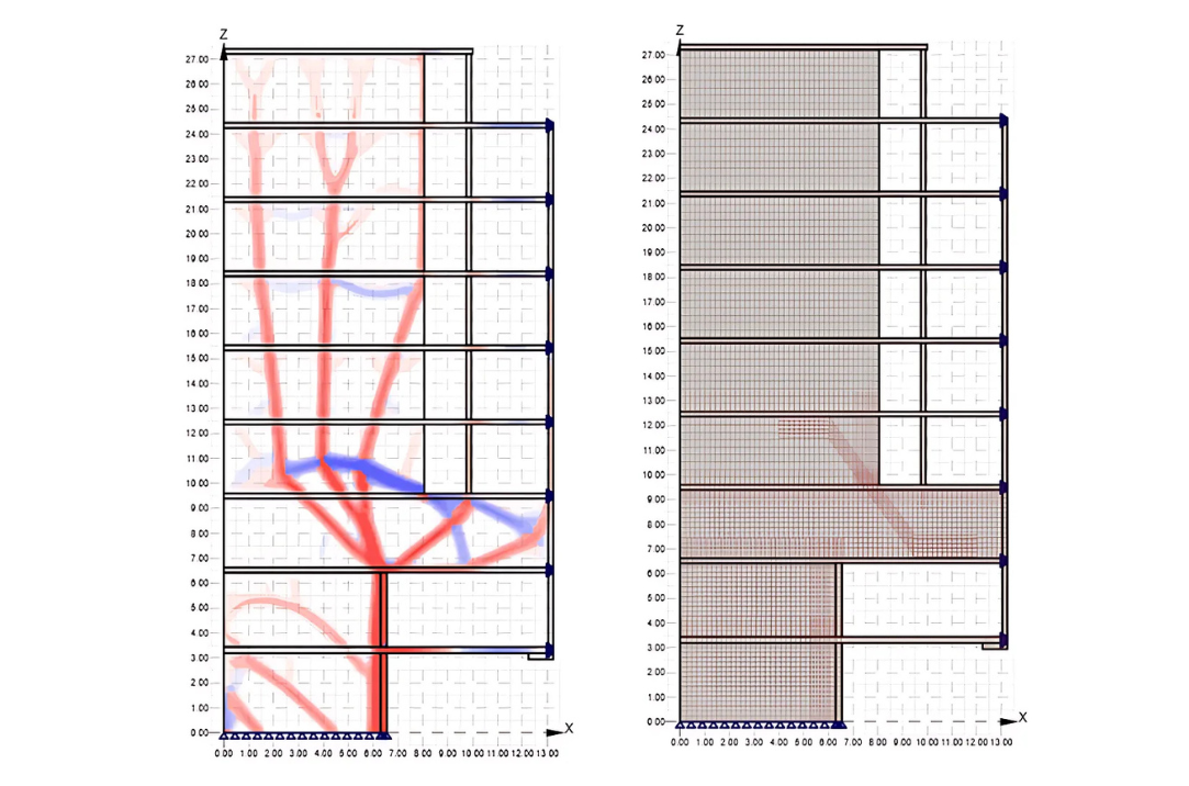 The reinforcement design was based on Topology optimization. The output of this tool is a topology of compression fields and areas in tension. The shape of this "truss" can be used to most efficiently place the reinforcement and identify critical compressive areas in the structure.