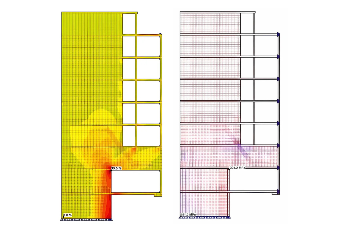 The structural layout of the building raised several questions regarding the actual interaction of the wall and horizontal elements. In the case of this wall, the main issue was the influence of the vertical stiffness of the beam located at the bottom of the wall. Since the material in a common FEM model is traditionally considered as linear, there was a concern that the stiffness of the beam would be overestimated on the "unsafe side".
