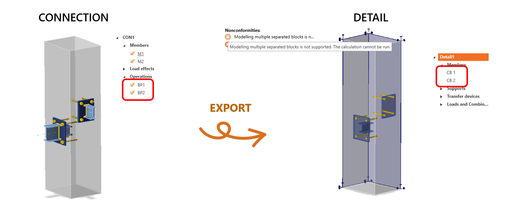 Ja, dat is mogelijk. En wat gebeurt er na het exporteren van de meervoudige verankering van Connection naar Detail? Er worden twee of meer betonblokken geïmporteerd naar Detail, afhankelijk van het aantal voetplaten in de verbinding, waarbij elke voetplaat zijn eigen betonelement heeft. De beperking (zie Bekende beperking voor Detail 3D) is dat meerdere betonblokken niet worden ondersteund in Detail. De gebruiker moet dus alle blokken behalve één verwijderen en alle andere voetplaten aan dat blok relateren. Dan wordt de juiste verdeling van anker- en laskrachten bereikt.