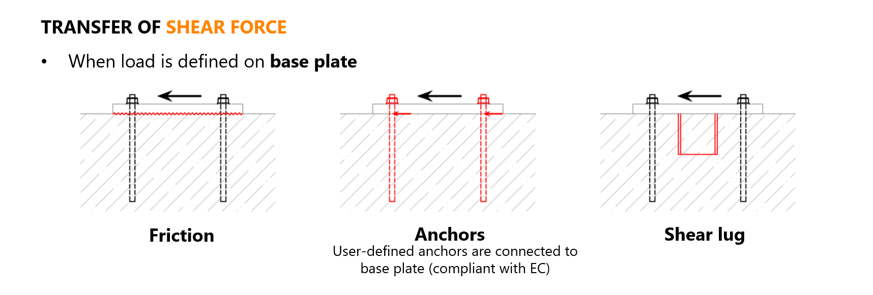 De afchuifkracht kan overgebracht worden via wrijving, ankers of afschuifkluft, maar slechts één methode kan tegelijkertijd gebruikt worden. Zorg bij wrijving voor de juiste volgorde van belastingsgevallen: eerst druk (permanent), dan afschuiving (variabel). Als dit niet correct gebeurt, kan de voetplaat "wegvliegen".