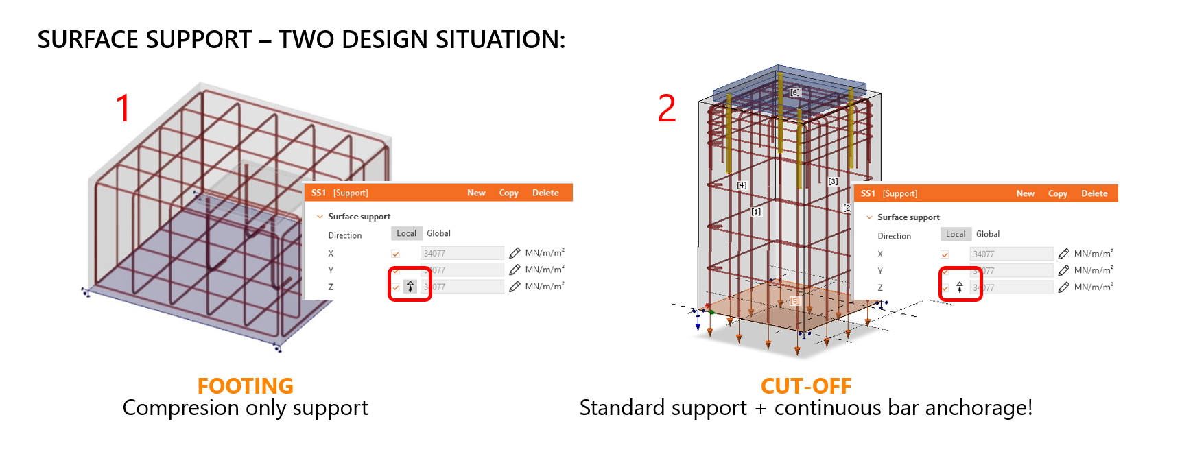 1) Gebruik voor funderingen die op de grond rusten een ondersteuning die alleen stijfheid in druk biedt. Vergeet niet het eigengewicht handmatig toe te voegen als belastingsgeval, aangezien dit niet automatisch wordt gedaan. Het eigengewicht kan helpen omkantelen van het betonblok te voorkomen.
