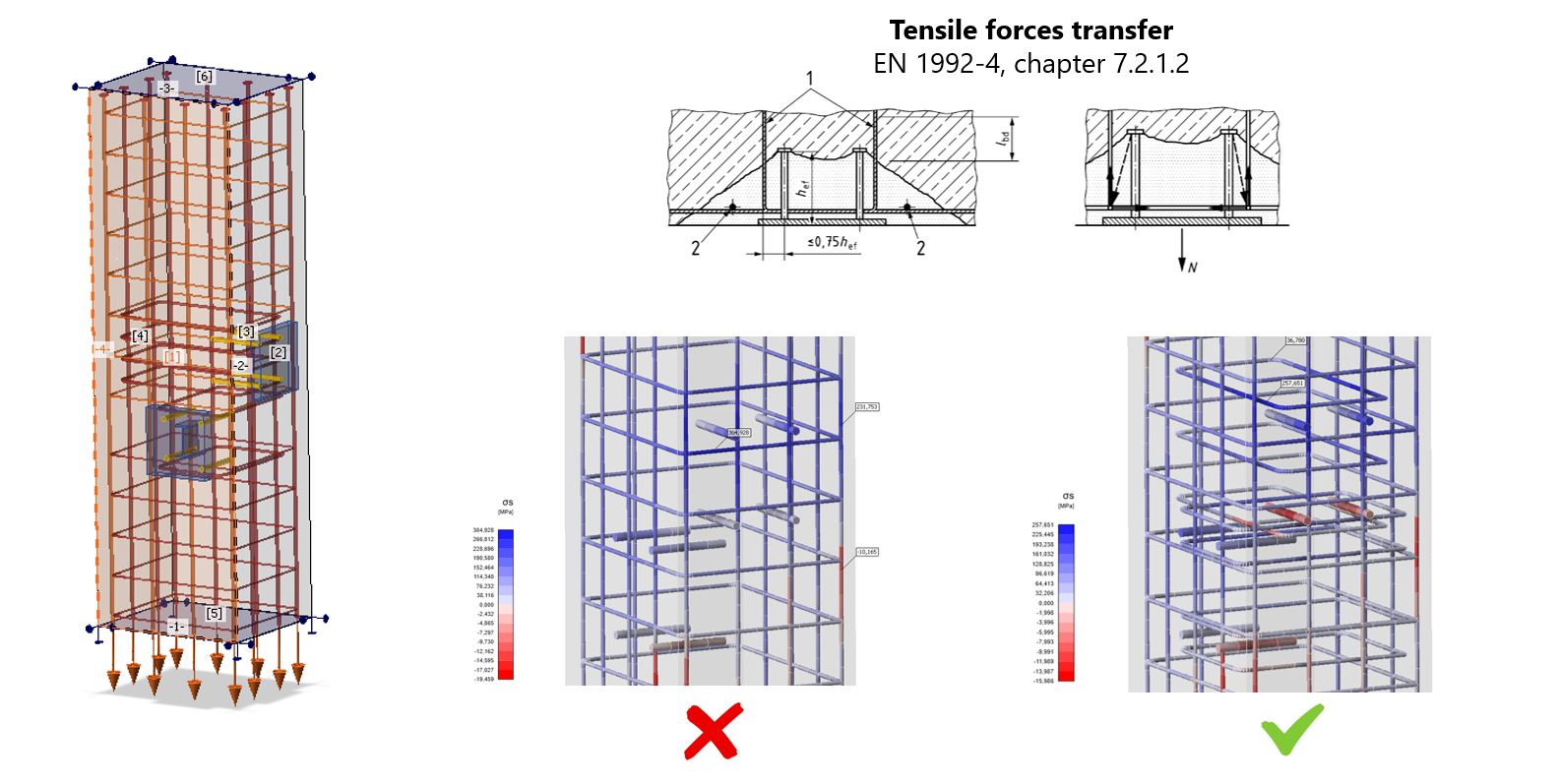 De wapening moet voldoen aan de detailleringsregels uit de norm, zoals de aanvullende wapening voor trek- en dwarskrachtoverdracht volgens EN 1992-4. De applicatie zorgt ervoor dat krachten correct worden overgedragen: druk wordt opgevangen door het beton, trek door de wapening. Aangezien beton geen treksterkte heeft, is correcte wapening cruciaal.