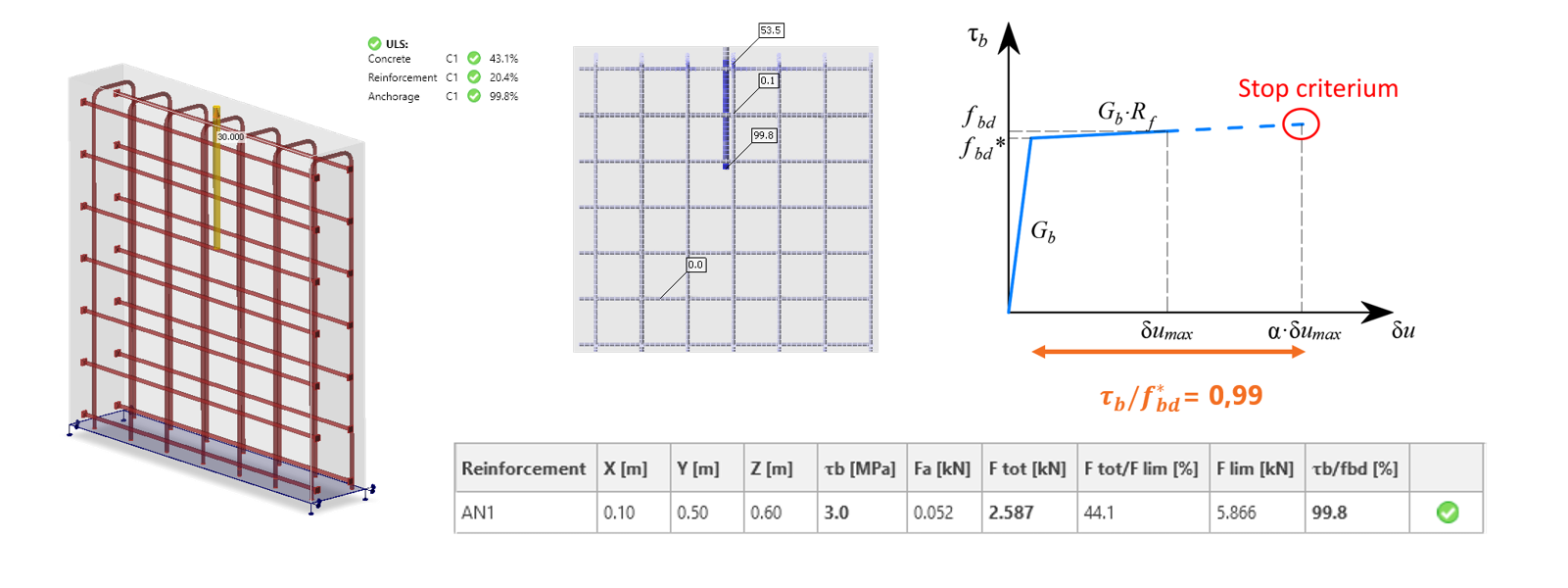 In de meeste modellen overschrijdt de aanhechtspanning in de verankering 99,9% uitnutting voor zeer lage belastingsniveaus. De reden hiervoor kan worden gevonden in het spanning-rekdiagram van de verbinding tussen het anker/wapening en het beton, zoals weergegeven in de onderstaande figuur. De aanhechting (Bond) bereikt zijn uiterste spanning snel en elke verdere belasting leidt tot plastische vervorming (slip). Het is handiger om te kijken naar de Ftot / Flim waarden.