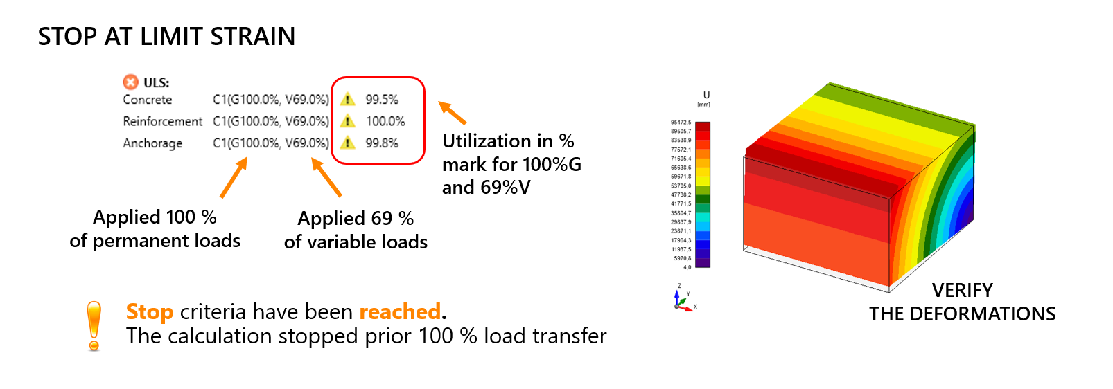 Standaard staat de optie "Stop at Limit Strain" aan. Dit betekent dat de berekening stopt zodra bepaalde UGT-criteria worden overschreden. De uitnutting wordt gecontroleerd voor beton, wapening en verankering.