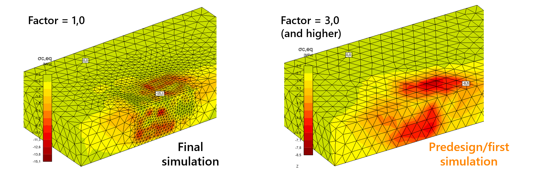De mesh-kwaliteit is cruciaal voor 3D-simulaties, vooral voor niet-lineaire problemen, omdat het een directe invloed heeft op de rekentijd. De mesh-vermenigvuldigingsfactor varieert van 0,5 tot 5, waarbij 1 de standaard is. Het gebruik van een factor 5 versnelt simulaties en helpt bij het identificeren van fouten, maar de resultaten kunnen onnauwkeurig zijn (meer dan 30% fout). Na verificatie van het model is de voorgestelde factor 1 of lager voor nauwkeurige spanning en rek, waardoor de analysetijd toeneemt. Een grove mesh (hogere factor) wordt gebruikt voor het voorontwerp, terwijl een fijnere mesh (lagere factor) nauwkeuriger resultaten oplevert in de uiteindelijke simulatie, vooral rond ankers.