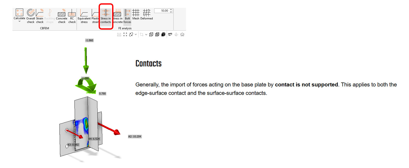 In Connection is het mogelijk om een Contact tussen twee platen in te stellen en de contactspanning weer te geven. Het is echter een beperking (zie Bekende beperking voor Detail 3D) van de verankeringsexport van Connection naar Detail dat deze contactspanning niet wordt geïmporteerd. Het gevolg van het ontbreken van effecten veroorzaakt door de contactspanning is dat de geïmporteerde krachten niet in evenwicht zijn op de voetplaat en dat de berekening niet kon worden uitgevoerd vanwege de enorme vervorming van de staalplaat en de modelafwijking.
