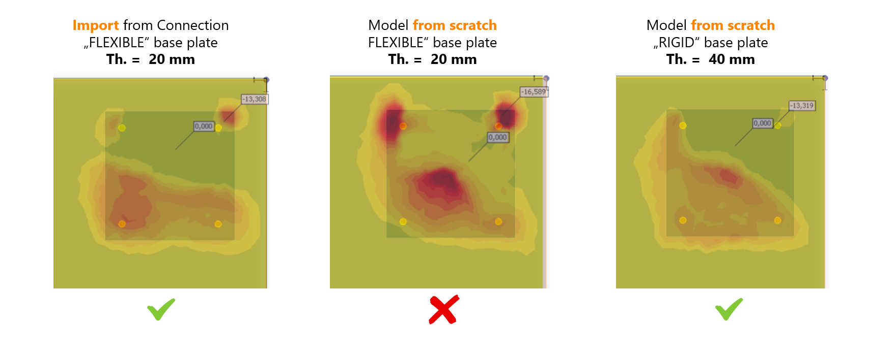 De resultaten toonden aan dat flexibele platen die rechtstreeks in Detail 3D waren gemodelleerd, onnauwkeurige spanningsverdelingen en kunstmatige wrikeffecten produceerden. De stijve plaat elimineert deze problemen en geeft resultaten die consistent zijn met de Connection export. Ankerkrachten waren vergelijkbaar in het eerste en het derde model, maar het tweede (flexibele plaat in Detail 3D) overschatte de ankerkrachten met meer dan 30%, waardoor het een onjuiste benadering was. Daarom is de suggestie om de stijve voetplaat te gebruiken als er niet vanuit Connection wordt geëxporteerd en op één punt wordt belast, om de interactie tussen de voetplaat en het beton zo dicht mogelijk bij de werkelijkheid te krijgen.