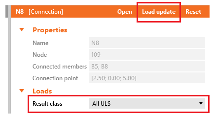 Een resultaatklasse kan worden toegewezen aan een willekeurig ontwerpitem met behulp van het vervolgkeuzemenu in de eigenschappen van het projectitem. Nadat een andere resultaatklasse is geselecteerd, kan de Load update-knop worden gebruikt om belastingseffecten te genereren voor het projectitem op basis van de nieuw geselecteerde resultaatklasse. Als het projectitem al is berekend, worden met deze actie de oude resultaten verwijderd.