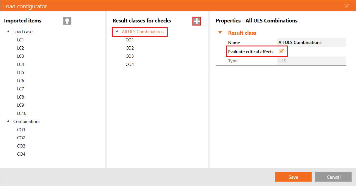 Geïmporteerde belastingseffecten kunnen worden toegewezen aan resultaatklassen. Resultaatklassen zijn bedoeld om belastingseffecten te sorteren naar specifieke groepen, wat het ontwerpproces kan vereenvoudigen en versnellen. Resultaatklassen kunnen worden aangemaakt met het"+"-pictogram en verwijderd met een klik met de rechtermuisknop.