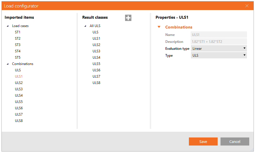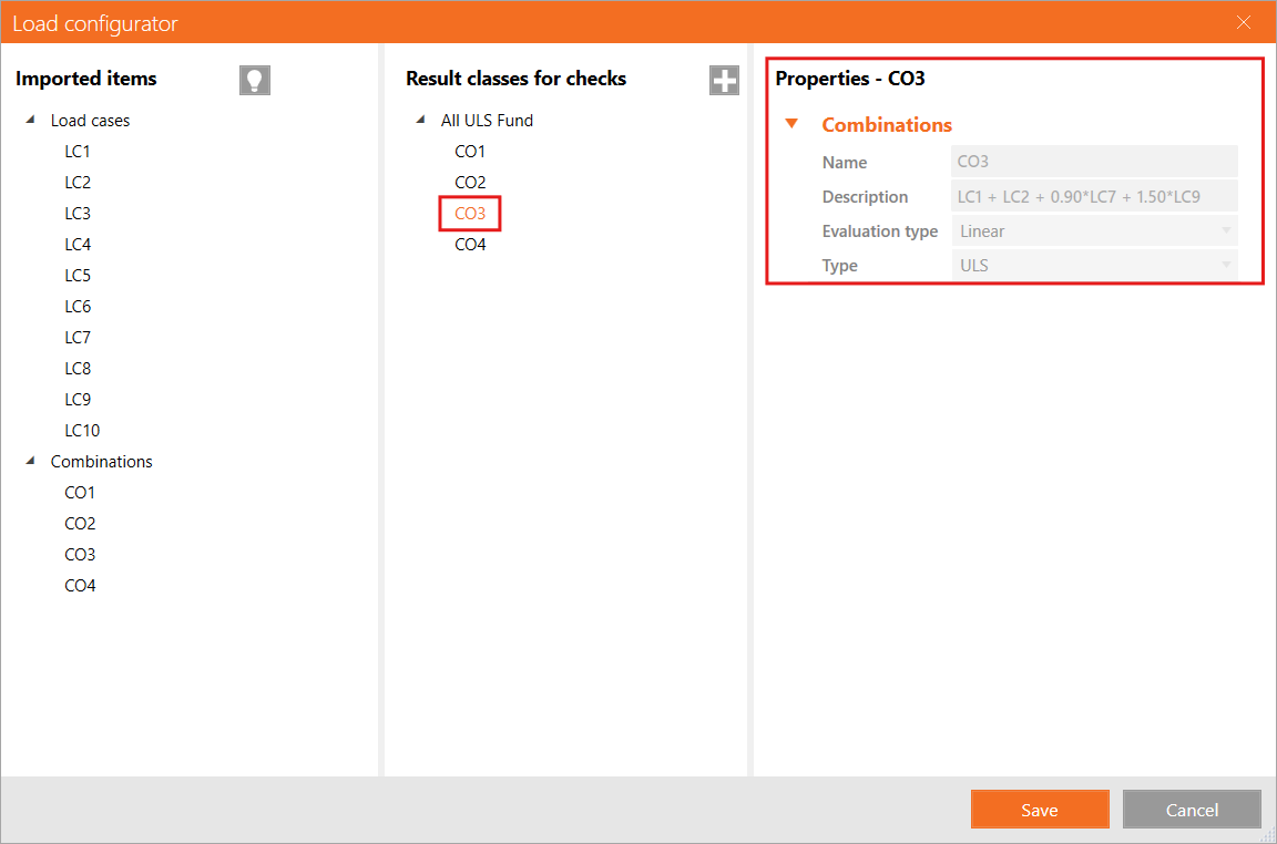 De belastingsconfigurator toont de geïmporteerde belastingsgevallen en belastingscombinaties. De eerste kolom toont alle belastinggevallen en combinaties die zijn geïmporteerd uit het gekoppelde FEA-model. De tweede kolom toont de resultaatklassen die worden gebruikt voor het Checkbot-project.