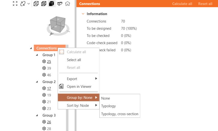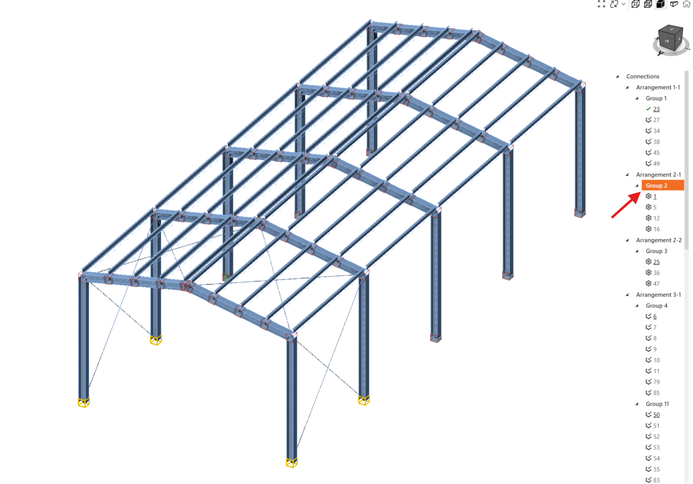 De groeperingsfunctionaliteit maakt automatisch groepen op basis van typologie en/of doorsneden. De groepen worden vervolgens geordend van minst complex naar meest complex op basis van het aantal verbonden leden. Elke groep wordt vertegenwoordigd door de referentieverbinding (onderstreept in de boom) die automatisch wordt aangewezen als de ouderverbinding die het ontwerp voor de hele groep aanstuurt. Alle andere verbindingen worden behandeld als kindverbindingen.