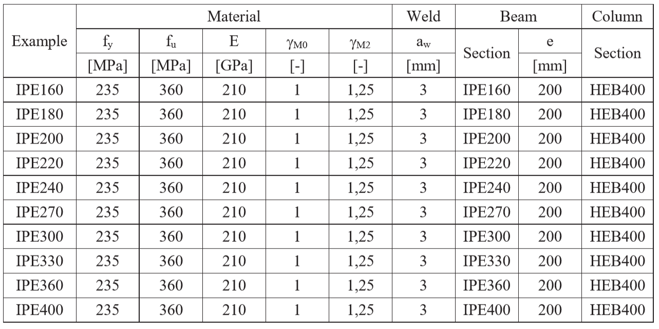 The fillet weld is the only component examined in the study. The welds are designed according to Chapter 4 in EN 1993-1-8:2005 to be the weakest component in the joint. The design resistance of the fillet weld is described in Section 4.1. Overview of the considered examples and the material are given in the Tab. 4.4.1. A geometry of the joint with dimensions is shown in Fig. 4.4.1.