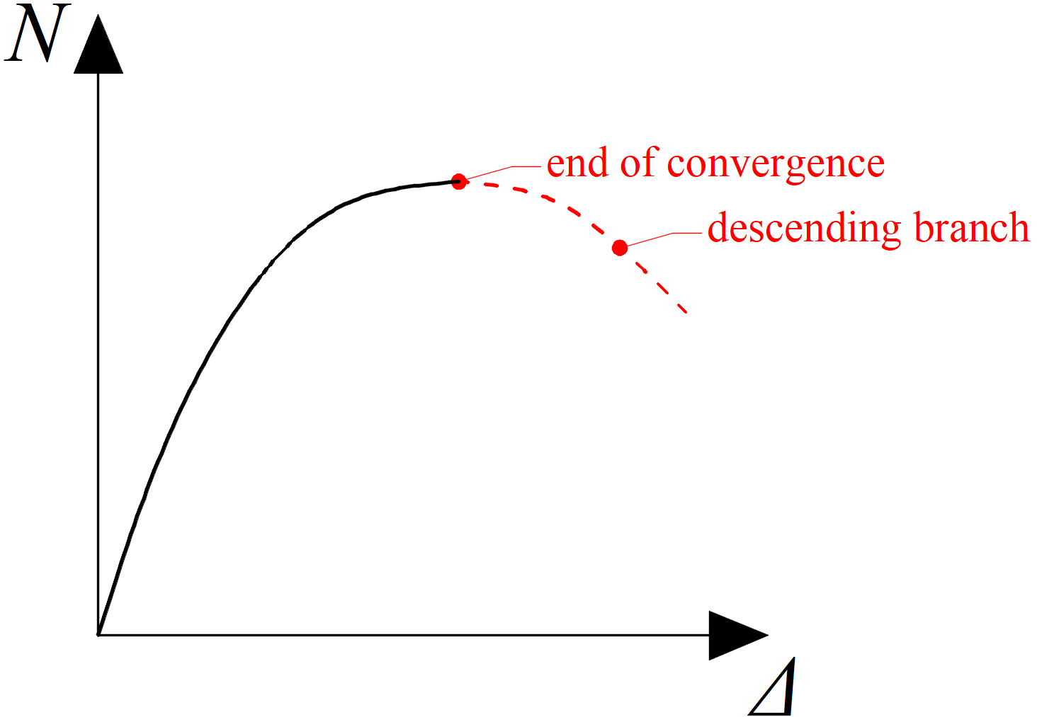 Ultimate limit state may be reached by attainment of a limiting value of the principal membrane strain – recommended as 5 % or attainment of the maximum load for members susceptible to buckling. Maximum load is reached when the solver stops converging (because the model is loaded by forces and not by displacements). End of convergence means that no load increment may be applied to the model and the analysis may stop below 100 % of defined load. Descending branch of the load-deformation diagram cannot be captured.