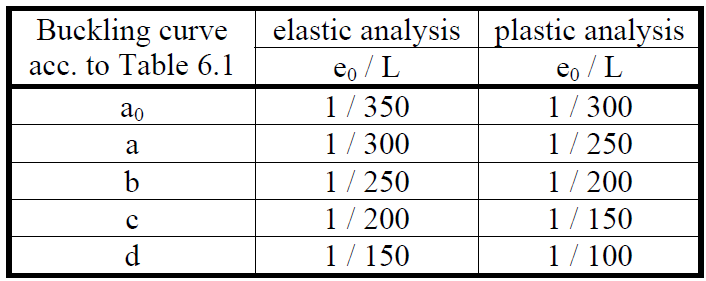 The plastic analysis is used so the right column of the table should be used. The amplitude e0 should be chosen according to the table above for predominantly compressed member where flexural, torsional or torsional-flexural buckling is expected. If the member is predominantly bended and main failure mode is lateral-torsional buckling, the amplitude e0 may be decreased by factor k = 0.5 according to EN 1993-1-1, Cl. 5.3.4 (3).