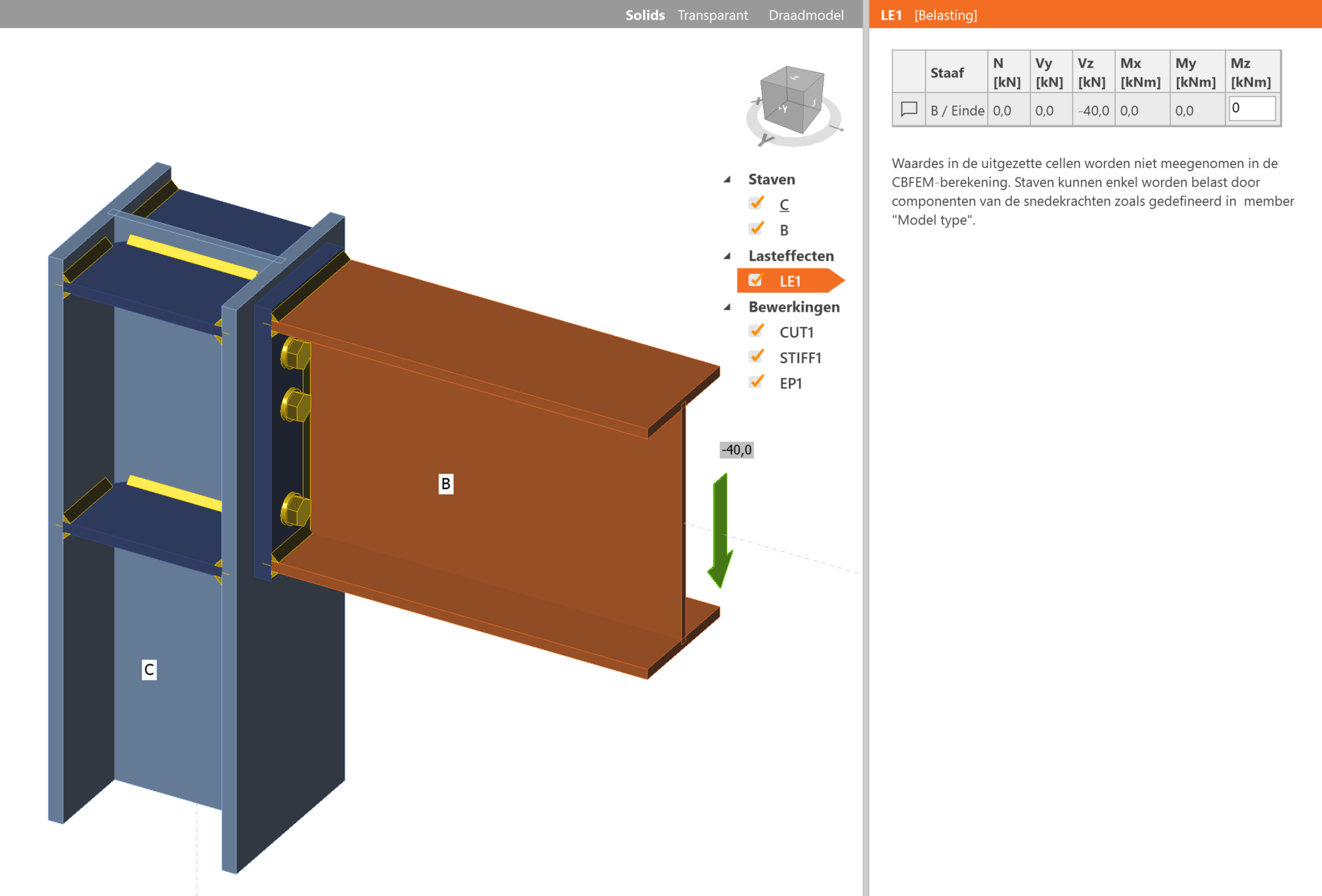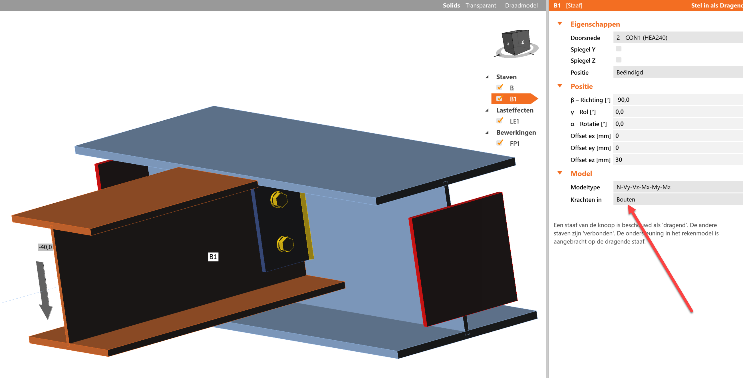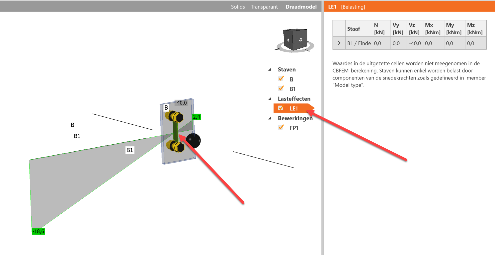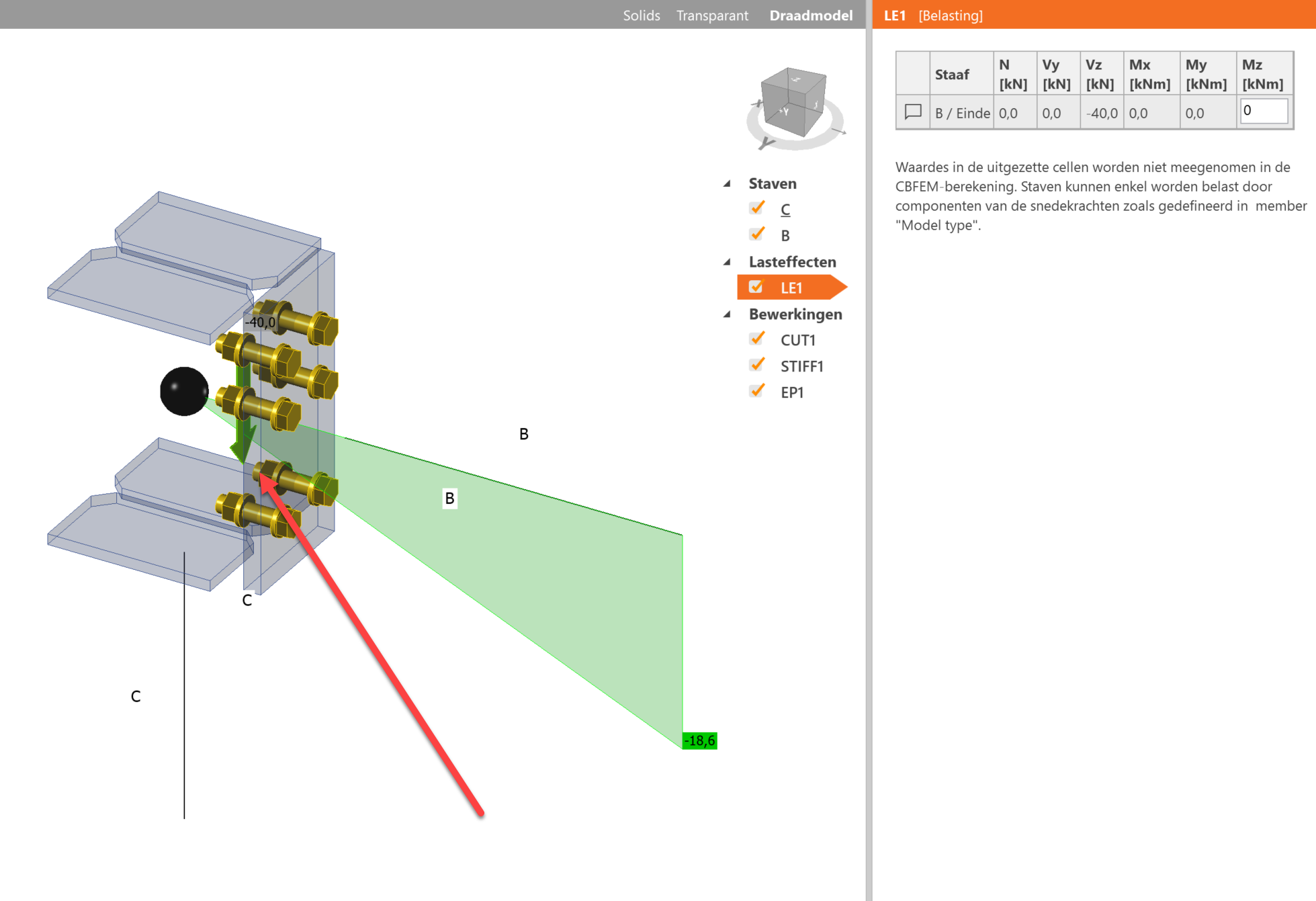 Hieronder ziet u een Draadmodelweergave van dezelfde verbinding met in de groene pijl de optredende dwarskracht van 40 kN.