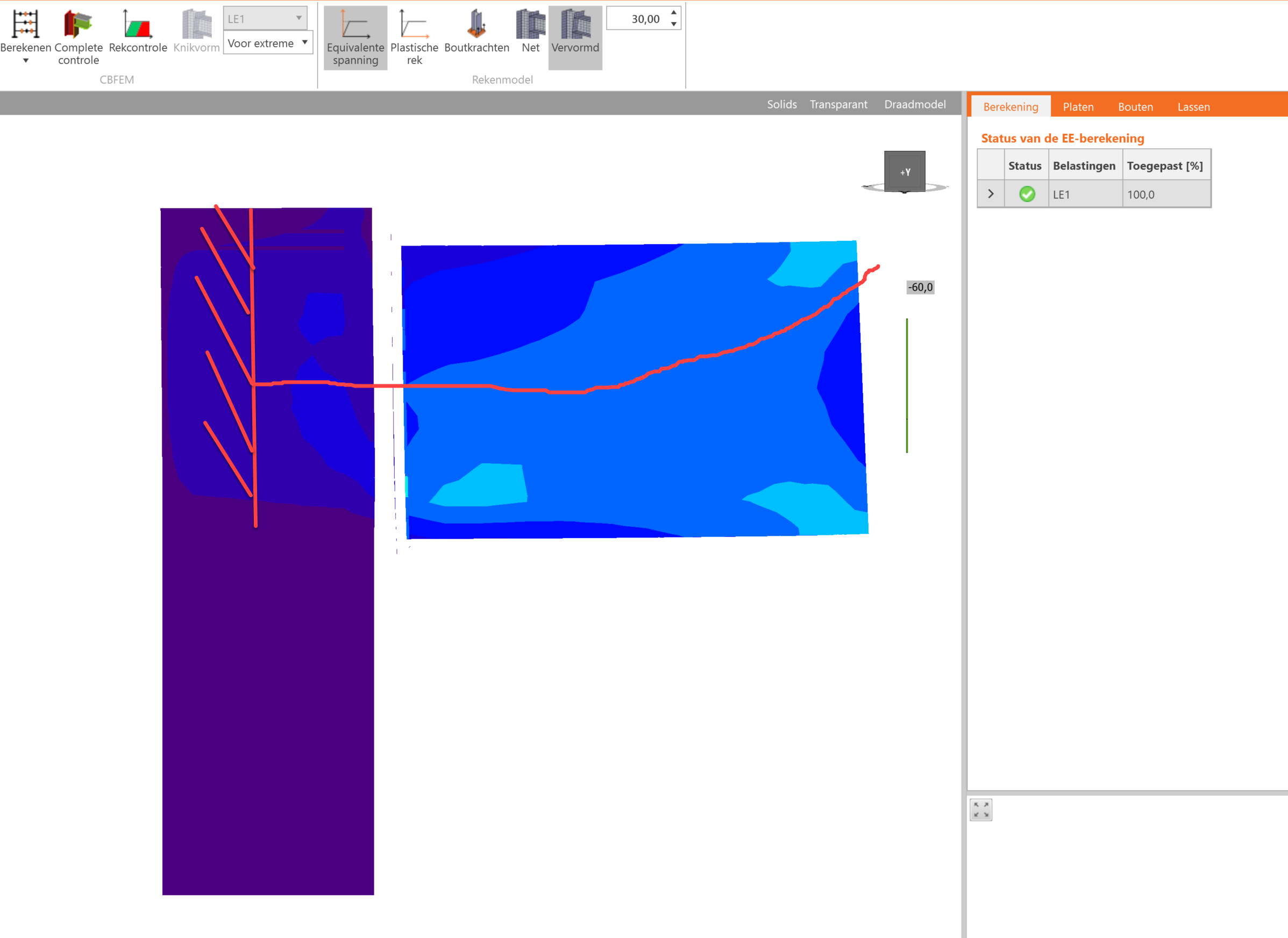 Hieronder zit u een verbinding belast door alleen een dwarskracht in de solidweergave.